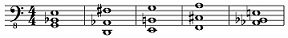 Notenbeispiel 13: Klavierkonzert, 1. Section, Die Klänge der fünf Abschnitte.